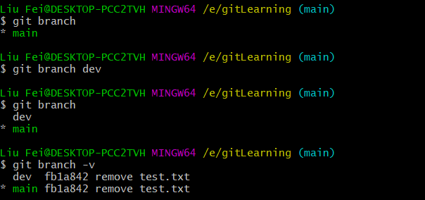 1 | git branch #查看所有分支,* 号代表当前工作分支 |